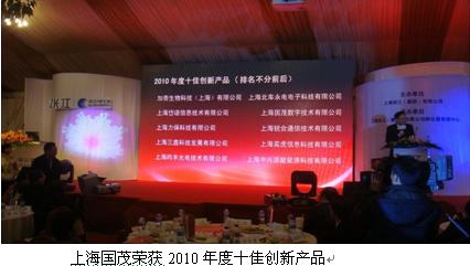 2011年1月18日,在上海張江(集團(tuán))有限公司舉辦的“2010年度張江創(chuàng)新風(fēng)云盛典”上,上海國(guó)茂數(shù)字技術(shù)有限公司榮獲“2010年度十佳創(chuàng)新產(chǎn)品獎(jiǎng)”,公司總經(jīng)理王國(guó)中上臺(tái)領(lǐng)獎(jiǎng)并應(yīng)邀作為唯一的獲獎(jiǎng)企